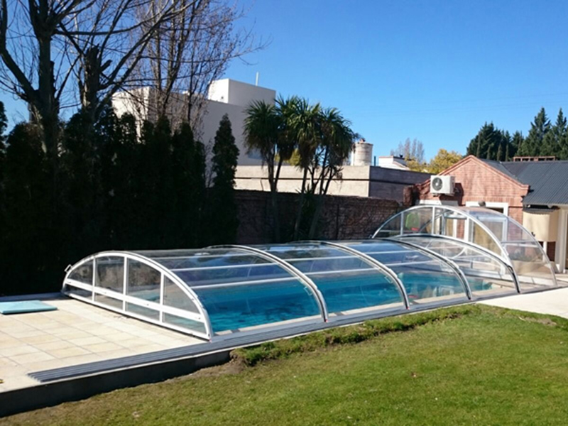 Modelo donde las guías utilizadas para el desplazamiento de los módulos, son instaladas a lo largo de la piscina. El techo está construido con módulos simétricos, que se ensamblan uno debajo del otro.